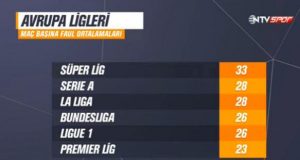 İngiltere, Almanya ve İspanya gibi liglerde 60-65 dakika topla oynanırken, ligimizde bu rakam 50-55 maç hatta bazı maçlarda 45-50 dakika arasına iniyor. Ligin 11’inci haftasında oynanan Fenerbahçe-Galatasaray derbisinde tam 40 defa faul çalındı ve topun oyunda kalma süresi sadece 47 dakika 16 saniyeydi. Aynı şekilde ligin 13’üncü haftasında oynanan Fenerbahçe-Beşiktaş derbisinde oyun, fauller nedeniyle 42 kez durdu ve topun oyunda kalma süresi ise 49 dakika 4 saniyeydi. Aynı hafta İngiltere’de oynanan Manchester City-Chelsea maçında verilen faul kararı sayısı 23 iken, Barcelona-Real Madrid derbisinde ise oyun 35 kez faulle durduruldu.